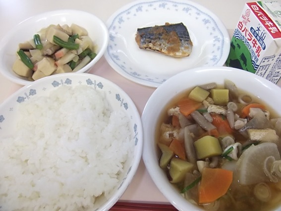 ご飯、牛乳、さわらのピリ辛焼き、とりっこ汁、高野豆腐の含め煮