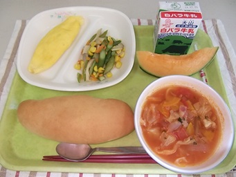 大山小麦コッペパン、牛乳、ツナマヨオムレツ、ミネストローネ、アスパラのソテー、メロン