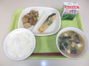 七草ご飯、牛乳、はまちの照り焼き、わかめとじゃがいものみそ汁、いりどり、かりかり黒豆