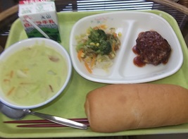 大山小麦コッペパン、牛乳、春野菜のハンバーグ、グリンピースのポタージュ、ブロッコリーサラダ