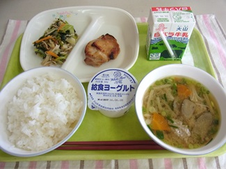 ご飯、牛乳、若鶏肉のしょうが焼き、あじのつみれ汁、ほうれんそうのおかか煮、ヨーグルト