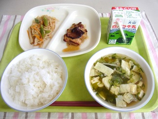 ご飯、牛乳、若鶏肉の照り焼き、ゆばのすまし汁、切干大根の含め煮、(中)手作りカルピスゼリー
