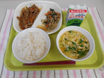 発芽玄米入りご飯、牛乳、スタミナ焼肉、スーミータン、炒めナムル