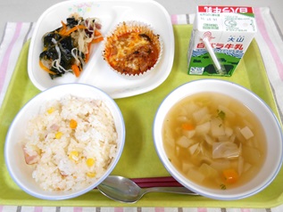 コーンとベーコンのピラフ、牛乳、なすのミートグラタン、コロコロ野菜スープ、海そうサラダ
