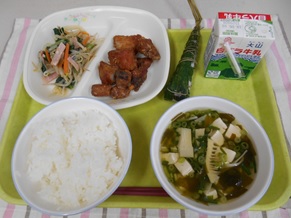 ご飯、牛乳、かつおのみそ香揚げ、若竹汁、千草和え、ちまき