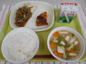 【河原・用瀬・佐治町産食材】 ・米 ・玉ねぎ ・さやいんげん ・梨ピューレ ・えのきたけ ・みそ 【鳥取県産食材】 ・牛乳 ・白ねぎ ・干ししいたけ ・豚肉 ・たら ・煮干し ・豆腐