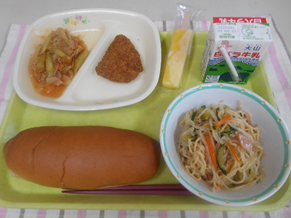 大山小麦黒糖パン、牛乳、かぼちゃとひき肉のフライ、冷やし中華、河原アスパラガスのスタミナ炒め、みかんバー