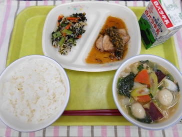 今年、東京オリンピック・パラリンピックが開催されることにちなんでアスリート献立です。丈夫なからだをつくるには、食事が大切です。アスリート汁は、豚肉やたっぷりの野菜、さつまいもやもちが入った、からだをつくるために必要な栄養素がつまったみそ汁です。