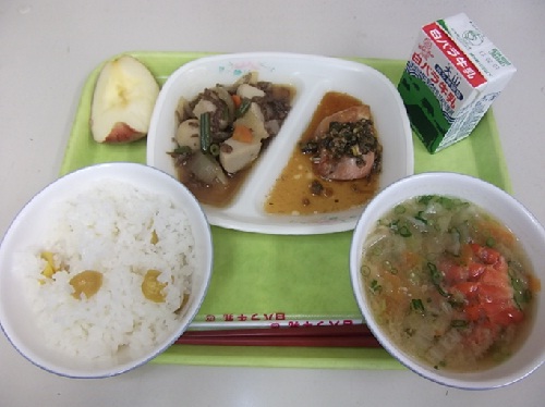 栗ご飯、牛乳、若鶏肉のねぎ焼き、かに汁、里芋の煮物、りんご