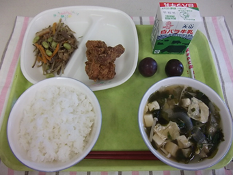 ご飯、牛乳、若鶏肉のカレー揚げ、ゆばのすまし汁、きんぴらごぼう、ぶどう(2粒)