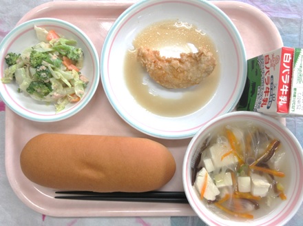 大山小麦コッペパン、牛乳、ささみのレモンソースがらめ、とっとりきくらげのスープ、ブロッコリーのツナサラダ