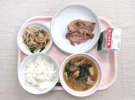 ご飯、牛乳、豚肉の塩こうじ焼き、じゃがいものみそ汁、いかともやしの炒め物