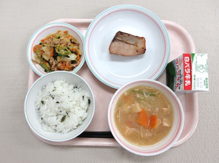 わかめご飯、牛乳、はまちの塩こうじ焼き、厚揚げのみそ汁、はくさいの炒め物