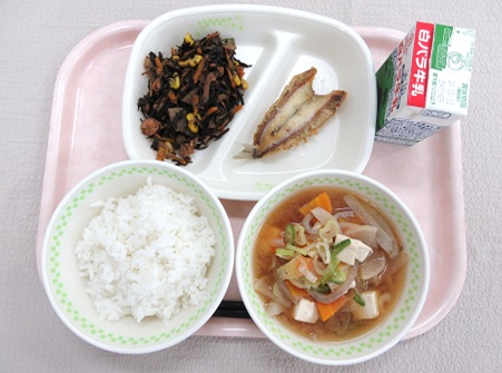ご飯、牛乳、沖ぎすの天ぷら、みそけんちん汁、いろどりひじき煮