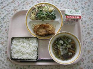 ご飯、牛乳、若鶏肉の薬味だれかけ、白ねぎともずくのスープ、さつまいもとらっきょうのサラダ
