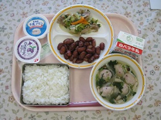 ご飯、牛乳、豚肉のねぎ塩炒め、いか団子のすまし汁、金時豆の含め煮、(小)セレクト給食 Aミルクプリン Bハスカップゼリー