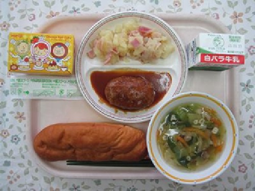 ・米粉パン(鳥取市) ・牛乳(鳥取県) ・じゃがいも(鳥取県西部) ・キャベツ(鳥取県中部) ・ちんげん菜(鳥取県中部) ・しめじ(鳥取県東部) ・ハンバーグ(鳥取県)