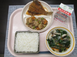 ご飯、牛乳、赤がれいのあんかけ、因幡のすまし汁、河内里芋のそぼろ煮