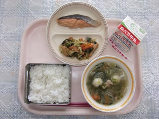ご飯、牛乳、さけの塩焼き、吉野汁、こまつなの煮びたし