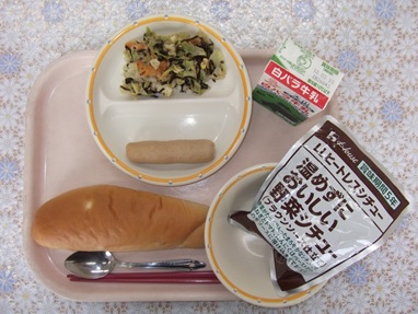 大山小麦さつまいもパン、牛乳、フランクフルト、レトルト野菜シチュー、ひじきとツナのごまサラダ