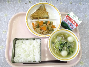 ご飯、牛乳、はたはたのフライ、だまこ汁、だいずの煮物