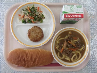 大山小麦コッペパン、牛乳、平つくね、カレーうどん、菜の花のツナ和え