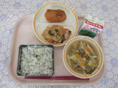 菜飯、牛乳、たらのフライ、豚汁、だいこんのべっこう煮
