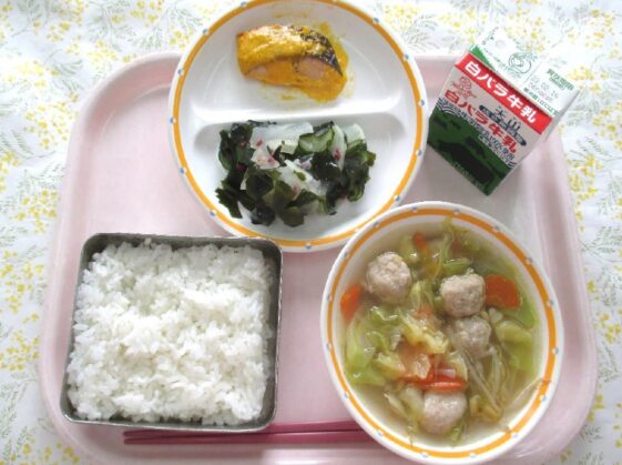 ご飯、牛乳、ますの黄金焼き、塩ちゃんこ、だいこんの梅サラダ