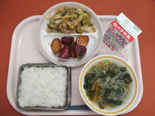 今日は鳥取市賀露・湖山・末恒地区でつくられたさつまいもを使った大学いもです。大学いもとは、油で揚げたさつまいもにあめ状にした砂糖などをからめた料理のことをいい、人気のあるメニューのひとつです。しっかり食べて楽しい給食時間にしてほしいと思います。