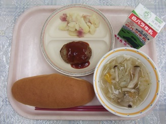 コッペパン、牛乳、ケチャップソースハンバーグ、オニオンスープ、ジャーマンポテト、(中)青梅ゼリー