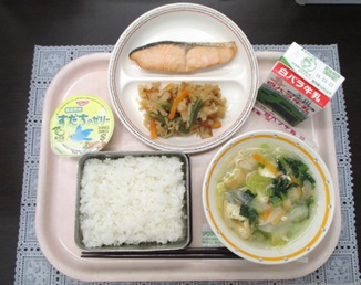 ご飯、牛乳、さけの塩焼き、こまつなのみそ汁、切干大根の含め煮、(小)すだちゼリー