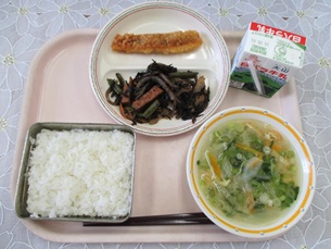 ご飯、牛乳、いかのフライ、油揚げのみそ汁、五目ひじき