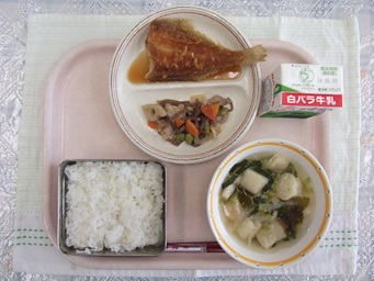 ご飯、牛乳、赤がれいのらっきょうソースかけ、新たまねぎのみそ汁、いりどり