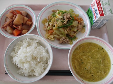 ご飯、牛乳、チキンピカタ、雑穀入りミネストローネ、キャベツの塩こうじ炒め
