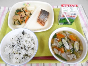 ご飯、牛乳、さわらのノンエッグマヨネーズ焼き、にらたまみそ汁、たけのこのピリ辛炒め