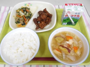 ご飯、牛乳、豚肉のバーベキューソースかけ、けんちん汁、こまつなののり酢和え