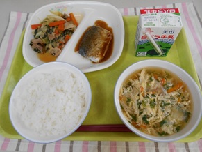 ご飯、牛乳、いわしの梅煮、手作り鶏だんご汁、こまつなの煮びたし、味付けのり