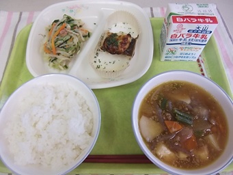 ご飯、牛乳、あじのカレームニエル、きぬさやとさつまいものみそ汁、豚肉とたけのこのピリ辛煮