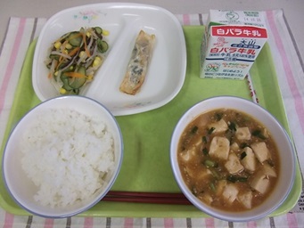 ご飯、牛乳、あじのカレームニエル、きぬさやのみそ汁、アスパラのごま炒め