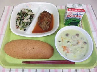 米粉パン、牛乳、ハンバーグきのこソース、コンソメスープ、コーンサラダ、みかんタルト