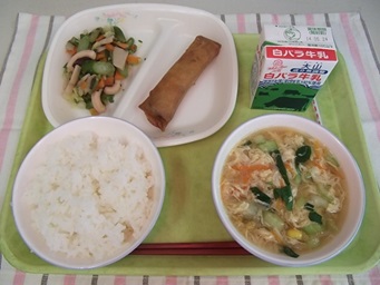 ご飯、牛乳、ほうれん草とえびのしゅうまい、八宝菜、フルーツミックス