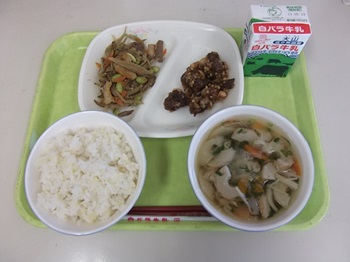 発芽玄米入りご飯、牛乳、かみかみさつま揚げ、とうふのすまし汁、れんこんのきんぴら