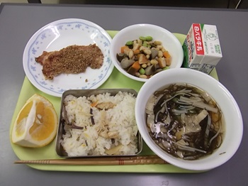 麦ご飯、牛乳、あごのコロコロさつま揚げ、小松菜と厚揚げのみそ汁、きんぴらごぼう