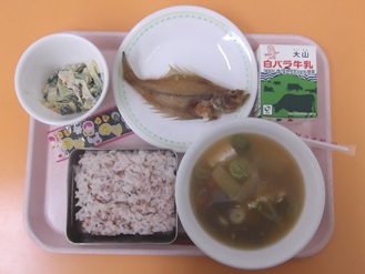 菜めし、牛乳、かれいのから揚げ、じゃがいものみそ汁、おからのいり煮