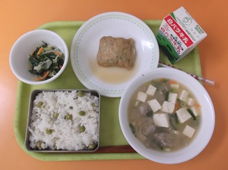 ご飯、牛乳、若鶏肉のみそがらめ、はくさいスープ、おからの炒り煮、なしチップ