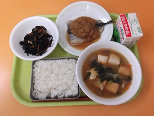ご飯、牛乳、いわしのかば焼き、にらたまみそ汁、小松菜とツナの炒めもの