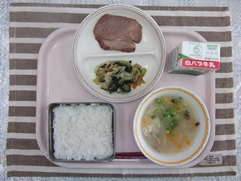 ご飯、牛乳、若鶏肉のらっきょうソースかけ、はくさいのみそ汁、根菜の五目炒め