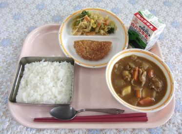 ご飯、牛乳、ハムステーキ、ポークカレー、グリーンサラダ