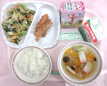 ご飯、牛乳、若鶏肉のから揚げ、紅白かまぼこのすまし汁、納豆サラダ、(福部未来学園1~9年、国府中)お祝いデザート