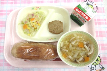 きなこ揚げパン、牛乳、つくね、コンソメスープ、カラフルソテー